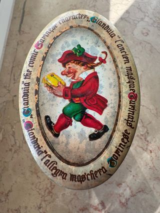 Tre scatole di Latta: Latta vintage di cioccolatini Gianduiotti Caffarel decorata con il personaggio di Gianduja tipica maschera di Torino Scatola farmaco Antipirosol ottime condizioni con incisioni originali Scatola biscotti Lazzaroni serie Verbano interno perfetto
