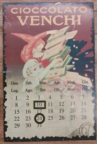 Bellissimo calendario da parete Cioccolato Venchi in metallo, con design vintage. Perfetto per gli amanti del cioccolato e del collezionismo. - Materiale: Metallo - Design: Vintage, con illustrazione di due figure e scatole di cioccolatini - Funzione: Calendario con giorni e mesi stampati - Decorazione: Ideale per cucina, ufficio o negozio