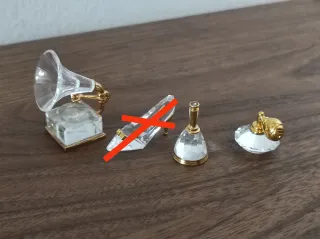 Bellissimo set di 3 miniature Swarovski in cristallo con inserti metallici color oro. Sono perfette per collezionisti o amanti del cristallo. - Include un grammofono, una campanella ed un flacone di profumo. - Gli oggetti sono in ottime condizioni, senza difetti evidenti. - Sono realizzati in cristallo trasparente con dettagli color oro. Mancano scatole originali. Foto del logo Swarovski per ogni oggetto, prova l'autenticità del set. Condizioni perfette, sempre tenuti in una vetrinetta; misure in foto, prezzo trattabile. #swarovski #swarovskicrystals #swarovskibijoux #swarovskielements #cristalloswarovski