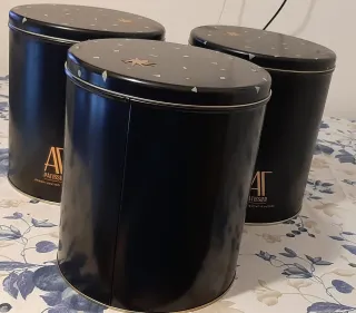 Scatole marroni in latta con coperchio decorato Interno in oro Riportano il marchio del fabbricante Cm 23 altezza Cm 21 diametro In perfetto stato Eur 5€ cadauna (si vendono sia assieme che separatamente)