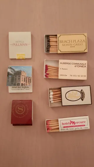 Lotto di 7 scatole di fiammiferi da collezione, alcune anni 60, rare, condizioni come da foto - Scatola Pullman Hotels - Scatola Beach Plaza Monte-Carlo - Scatola Auberge Communale d'Onex - Scatola Hôtel des Aiglons - Scatola Hotel Mercure - Scatola Sheraton