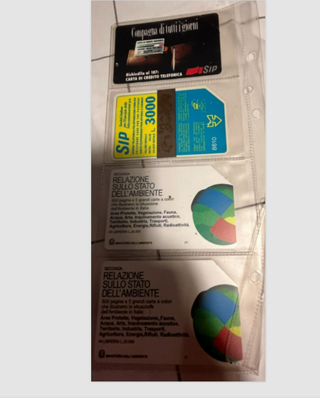 Lotto di 10 schede telefoniche SIP usate. - Una scheda SIP Compagna di tutti i giorni. - Una scheda SIP Carta di Credito Telefonica. - Una scheda SIP 3000 con valore L. 3000. - Una scheda SIP con codice 8610. - Due schede Relazione sullo Stato dell'Ambiente (seconda edizione). - Le schede sono in buone condizioni, come da foto.