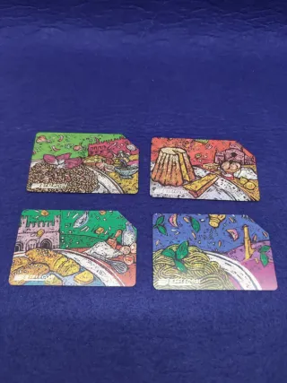 Set di 4 schede telefoniche Telecom con grafiche artistiche a tema culinario. - Risotto al radicchio rosso di Verona - pandoro - buslan - trenette al pesto