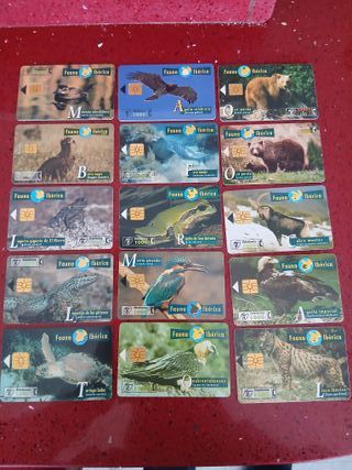 Lote di 15 schede telefoniche della serie Fauna Iberica. Include immagini di diverse specie della fauna spagnola. Ogni scheda rappresenta un animale diverso. Schede da collezione.