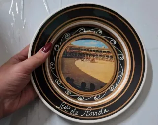 Piatto in porcellana con un'immagine di un'arena spagnola - Decorazione con cerchi concentrici. - Scritta Rito de Ronda sul bordo inferiore.