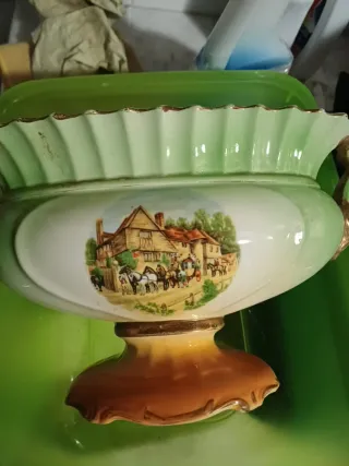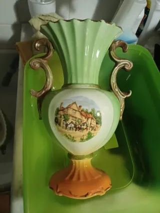Elegante vaso vintage risalente agli anni '60, con una decorazione dipinta a mano. - Decorazione con scena rurale e carrozze. - Bordi con finitura dorata. - Base in ceramica color terra di Siena.