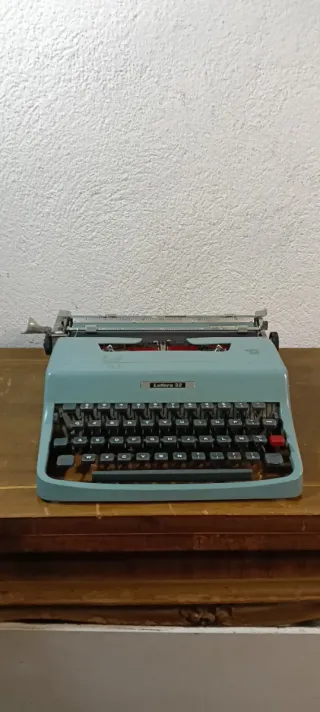 Macchina da scrivere Olivetti Lettera 32, un classico del design italiano. - Colore azzurro pastello. - Tastiera QWERTY. - Carrello scorrevole.