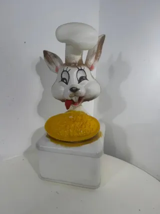 Espositore pubblicitario a forma di coniglio chef, ideale per attività commerciali. - Design a tema culinario. - Colore bianco e giallo. - Materiale in plastica resistente. Props Espositore pubblicitario di bustine di Zafferano a forma di Coniglio che era il testimonial dello Zafferano Leprotto anni 70’. Materiale plastica soffiata. Seguici sui nostri social: @alexdesignmilano.