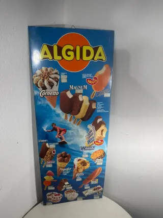 Insegna pubblicitaria per gelati Algida, ideale per attività commerciali. - Grafica vintage con vari gusti di gelato. - Marchio Algida ben visibile. Insegna targa tabella Listino prezzi GELATI marca ALGIDA con ragazzo su surf. Insegna ancora in LIRE. Epoca periodo anni 80’ in metallo vintage. Oggetto da collezione raro ed introvabile. Materiale metallo. Condizioni come in foto, con i mitici Gelati dell’epoca: Cooky Snack, Bikini, Bomboniera Etc. Misure 80x30 cm circa. Per vedere tutti gli annunci seguici sulle nostre pagine social:@alexdesignmilano.