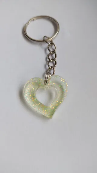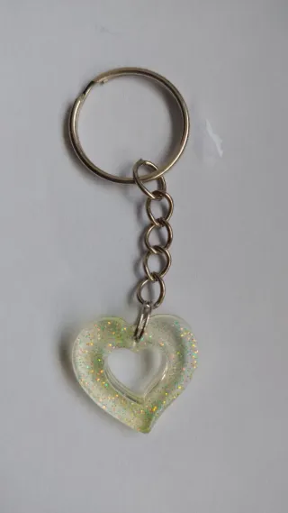 Portachiavi artigianale a forma di cuore, realizzato in resina trasparente con glitter. - Design a forma di cuore con cuore vuoto all'interno. - Glitter colorati per un effetto scintillante. - Completo di anello e catenella per chiavi. Peso 3 grammi.