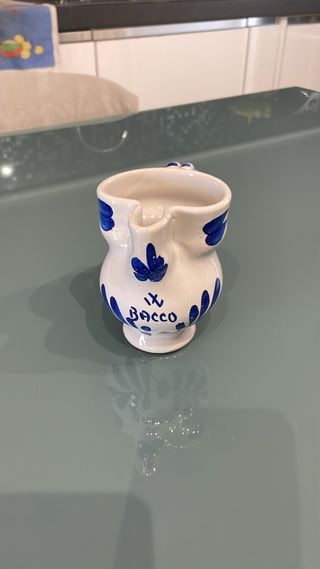 Mini caraffa in ceramica bianca con decorazioni blu. - Design con manico e beccuccio. - Scritta IX Bacco dipinta a mano.Misura cm 10,5