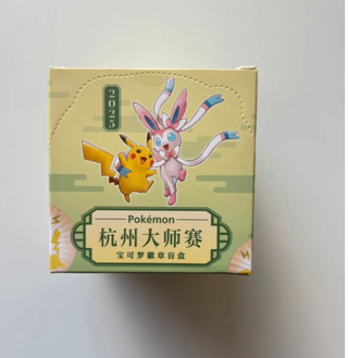 Spilla esclusiva del torneo Pokémon di Hangzhou 2025. - Design con Pikachu e Sylveon. - Edizione speciale 2025. - Tema del torneo di Hangzhou.