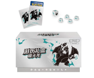 Scatola regalo Travel Gift Box a tema Charizard, edizione cinese. - Design con Charizard in nero e dettagli turchesi. - Include carte protettive per Pokémon. - Presenti dadi con simboli e numeri (10, 20, 30, 40). - Scritta Pokemon e Charizard visibile.