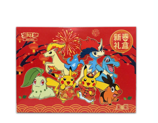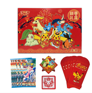 Box regalo a tema Pokemon per il Capodanno Cinese. - Design rosso festivo con lanterne e fuochi d'artificio. - Illustrazioni di Pikachu, Chikorita, Quilava, Feraligatr, Furfrou e un altro Pokemon. - Scritta 新春礼盒 (Box Regalo di Capodanno) in oro. - Scritta 宝可梦 (Pokemon) in alto a sinistra.