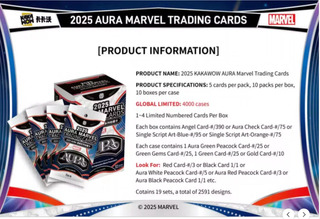 Scatola display sigillata di carte collezionabili Marvel Aura 2025. - Prodotto da Kaka How. - Contiene 10 pacchetti per scatola. - Ogni pacchetto contiene 5 carte. - Possibilità di trovare carte numerate limitate 1-4 per scatola. - Cerca la carta Aura Black Pen Card 1/1.