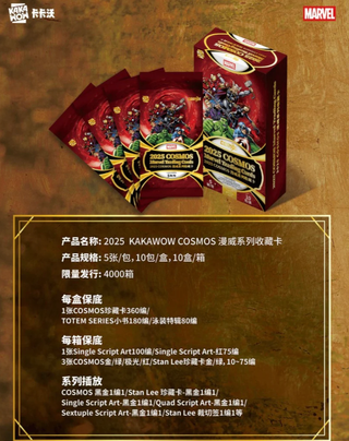 Scatola display sigillata di carte collezionabili Marvel Cosmos Kakawow 2025. - Edizione limitata a 4000 scatole. - Ogni scatola contiene 10 confezioni. - Ogni confezione contiene 5 carte.