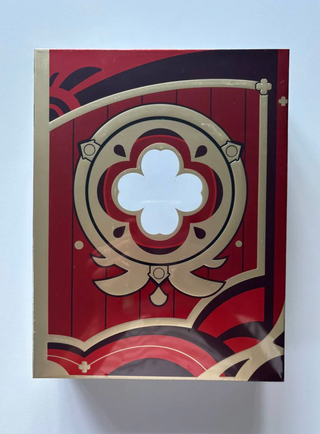 Scatola display celebrativa per il 10° anniversario di Genshin Impact. Il design è ispirato a un libro antico con dettagli dorati e rossi. - Scatola sigillata. - Design a tema Genshin Impact.