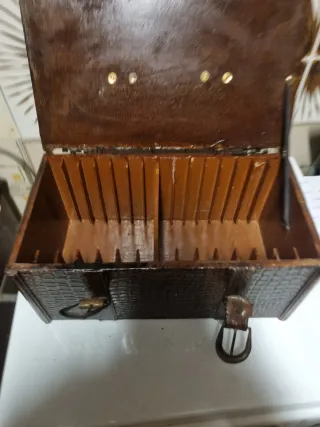 Porta CD antico vintage in legno Altezza 15/17cm x 25,5cm Difetti come foto, rotto un pezzettino interno, il cuoio/pelle del laccio si sta per rompere