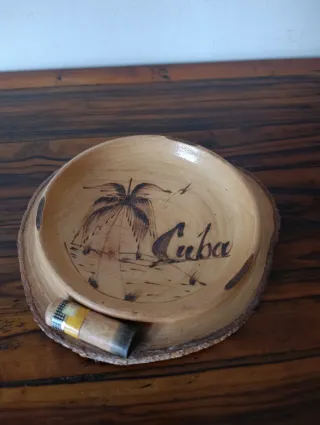 Posacenere in legno con 3 sigari cubani inclusi. Mai aperti. Un pezzo unico con un disegno a tema. - Materiale: Legno - Include: Sigari cubani