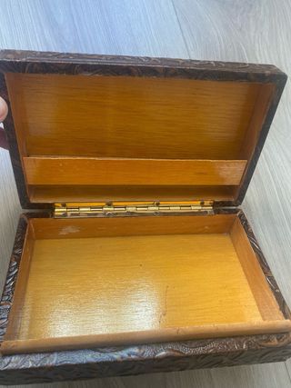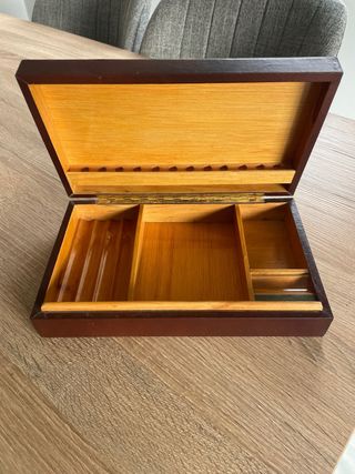 Elegante scatola antica per conservare sigari e sigarette. Realizzata con materiali di qualità e un design classico. Interno diviso in scomparti. Finitura esterna in tonalità legno. Coperchio con supporto per mantenerla aperta.
