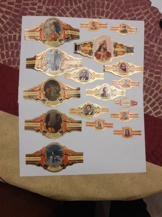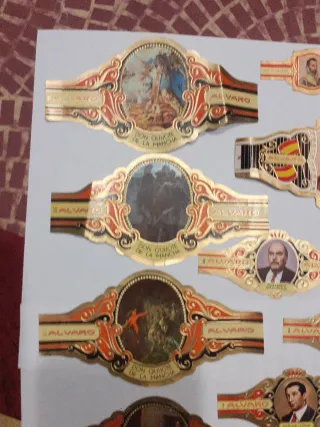 Collezione di vitolas di sigari del marchio Alvaro, provenienti dalle Canarie. Ogni vitola presenta design vari e dettagli dorati. Design con scene e ritratti. Dettagli in oro e colori vivaci. Marca: Alvaro. Origine: Canarie.