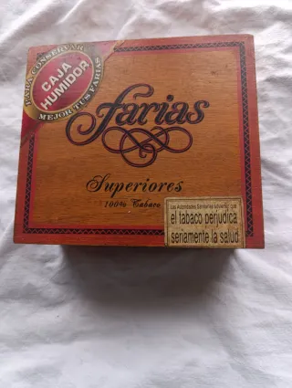 Scatola di sigari Farias vuota, con funzione di umidificatore. Design in legno. Incisione Farias Superiores. Etichetta sanitaria inclusa. Collezione, collezionista, vintage, retro, legno, Cuba, Habanos, sigari, vitola, vitolas, collezionismo.