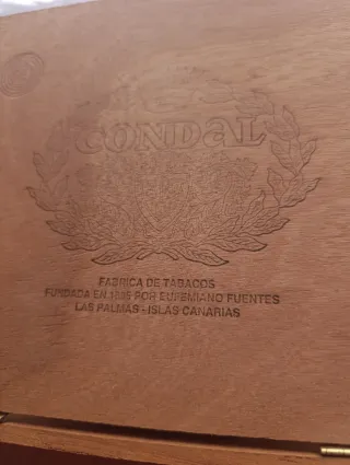 Scatola vuota di sigari del marchio Condal, fondata nel 1885. Realizzata in legno con incisione del logo e dello stemma del marchio. Informazioni sulla fabbrica: Fabbrica di Tabacco fondata nel 1885 da Eufemiano Fuentes, Las Palmas - Isole Canarie. Collezione, collezione, vintage, retro, legno, Cuba, Habanos, sigari, vitola, vitole, collezionismo.