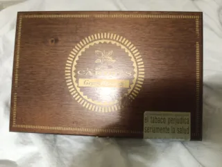 Scatola di legno elegante per sigari della marca Caribes Gran Reserva. Design classico in legno. Chiusura metallica dorata. Include un'avvertenza sanitaria stampata.