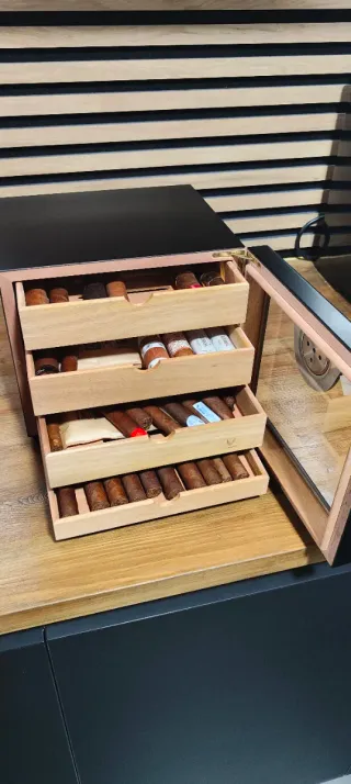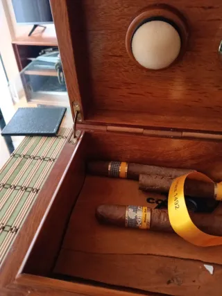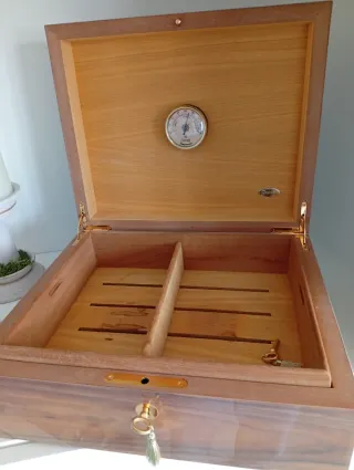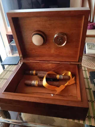 Elegante humidor per sigari con finitura in legno. Design moderno con frontale in vetro. Include igrometro per il controllo dell'umidità. Venduto come si vede nelle foto 😉 Invecchiamento medio di 2 anni, se sei appassionato del mondo del sigaro, al suo interno ci sono gioie fuori produzione ed edizioni limitate molto interessanti. Capacità approssimativa di 60 sigari. In regalo diversi Bóvedas per un perfetto controllo dell'umidità.