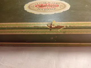 Scatola di legno per sigari, antica, della marca La Flor de Cano. L'Avana, Cuba. Anni '50/'60. Dimensioni 28,5 x 15 x 5 cm. Un tempo convertita in salvadanaio. Design classico in verde. Dettagli decorativi sui bordi. C159.