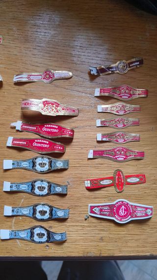 Set di etichette per sigari, alcune con disegni intricati e dorati. Ce ne sono molte di diversi tipi, tutte in perfetto stato, la maggior parte non è mai stata nemmeno su un sigaro, uscite direttamente dalla fabbrica. Etichette ALVARO, Etichette CAPOTE, Etichette LA FAMA, Varie etichette aggiuntive con dettagli dorati e colorati.