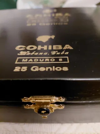 Scatola vuota elegante per sigari Cohiba Maduro 5 Genios. Design in colore nero. Iscrizione dorata del marchio Cohiba. Sigillo Habanos Denominación de Origen Protegida.