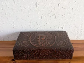 Antica scatola in legno per sigari con un bellissimo design esterno intagliato (effetto pelle scolpita). Il tema è Don Chisciotte di La Mancha, circondato da Sancio Panza e i classici mulini. L'interno conserva il legno naturale ed è diviso in scomparti, incluso un supporto scanalato per allineare i sigari o le sigarette. Perfetta per collezionisti, amanti del tabacco o da usare come originale portagioie o scatola dei ricordi. In ottimo stato vintage.