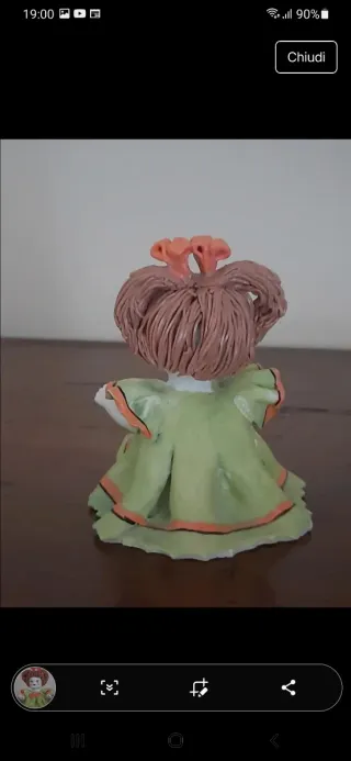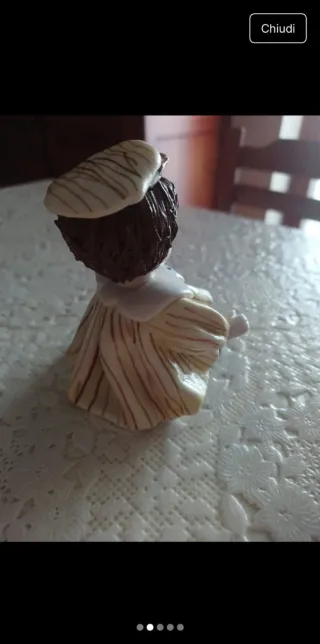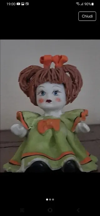 Deliziosa bambola in ceramica, un pezzo d'artigianato Capodimonte. - Dettagli dipinti a mano. - Vestito verde con fiocco arancione. - Capelli marroni raccolti con fiocchi. - Guance rosate e occhi azzurri.