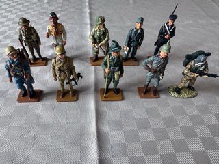 Collezione di 10 figure di soldatini di piombo, ciascuno presentato sulla sua base individuale. Figure di soldati storici. Include basi per l'esposizione. Dettagli di uniformi e attrezzature.