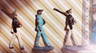 Lotteria di 3 antichi soldatini dell'URSS degli anni '60 che rappresentano marinai e militari sovietici. Sono figure originali in metallo pesante tipo piombo molto solide e pesanti con marca del prezzo e della fabbrica alla base che conferma la loro autenticità e l'epoca di produzione. Pezzi davvero antichi e da collezione con patina del tempo ideali per collezionisti di giocattoli sovietici vintage e militaria. Dimensioni 6X3 cm