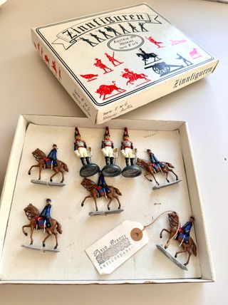 Set di figure di piombo Zinnfiguren degli Ussari Austriaci. Serie E N°4. Include 6 figure di cavalleria. Scatola originale. Etichetta di Pablo Burgos Antigüedades.