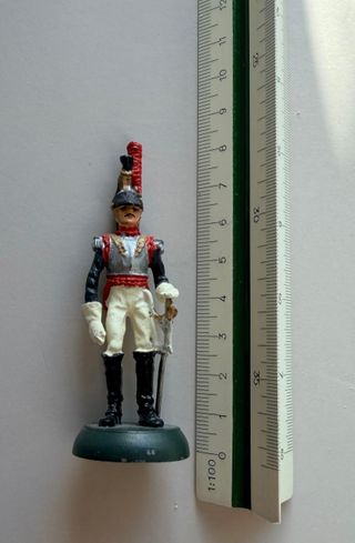 Figura da collezione di soldatino di piombo. Prezzo per unità - Uniforme blu scuro con dettagli in bianco e rosso. Pantaloni a righe bianche e nere. Base nera rotonda.