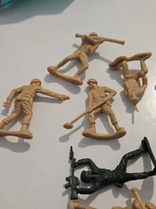 Set di soldatini in plastica, ideali per collezionisti o per il gioco. - Soldatini di colore beige e verde scuro. - Diverse pose e armi. - Materiale: plastica.