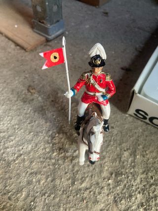 Set di figure di soldati e cavalli, ideale per collezionisti. - Figure di soldati con uniformi rosse. - Cavalli bianchi con selle dettagliate. - Include un soldato con bandiera. - In perfetto stato di conservazione e nella sua scatola originale.