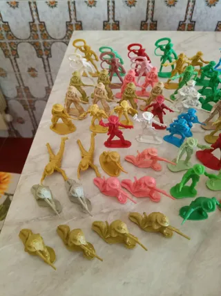 Lotto di soldatini giocattolo in plastica, ideali per collezionisti o per il gioco dei bambini. - Vari colori tra cui verde, rosso, giallo, blu, rosa e beige. - Diverse pose e modelli di soldatini. - Materiale plastico resistente.