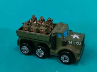 Camioncino militare vintage Micro Machines con soldatini e sacchi. - Camioncino in metallo e plastica. - Carico con soldatini e sacchi. - Dettagli militari come stella e numero di serie.
