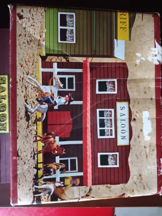 Casetta in stile western per soldatini, completa di Saloon e Sheriff. - Edificio a due piani con tetto rosso. - Dettagli come finestre e porte. - Base gialla e colonnine bianche.