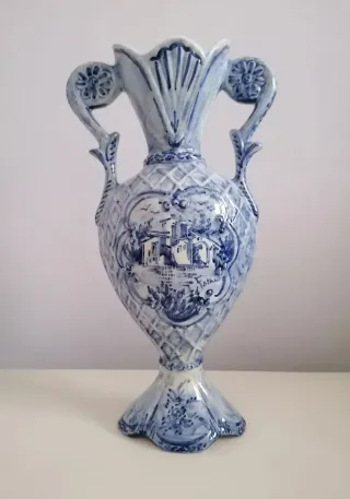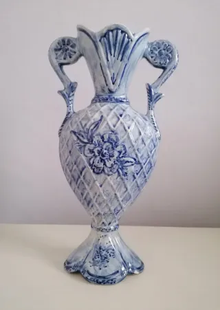Elegante vaso biansato in maiolica, decorato a mano con un paesaggio campestre. Un pezzo unico che porta con sé la tradizione ceramica di Albisola. Altezza circa 31 cm Presenta una piccola scheggiatura sul retro della base (vedi foto) - Decorazione dipinta a mano. - Motivo paesaggistico con casa e vegetazione. - Manici decorati con motivi floreali. - Base a calice con decorazioni floreali.