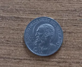 Moneta da 20 centesimi dello Stato della Città del Vaticano anni 1933/34 con l'effige di San Paolo - Dritto: Ritratto di Papa Pio XI - Rovescio: Stemma papale con le chiavi di San Pietro.