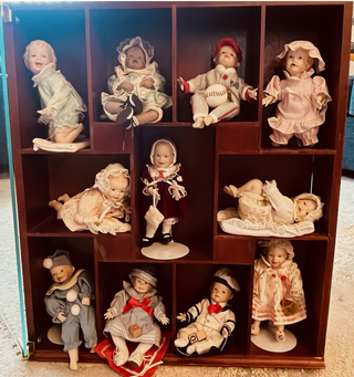 Bacheca in legno scuro con 11 bambole da collezione Ashton Drake. - 11 bambole in porcellana con vestiti dettagliati. - Diverse pose e abbigliamenti. - Ideale per collezionisti. misura di una bambola ca cm.18. Molto belle e mai usate. Le dimensioni della vetrina in legno sono 66 x 45 x 10 cm