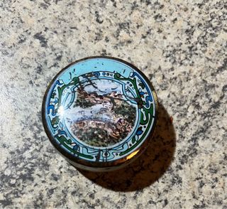Scatolina vintage in latta con decoro Gocce di Liquirizia. - Scatola rotonda in latta. - Motivo floreale e paesaggistico sul coperchio. - Bordi decorati con motivi blu e verdi.