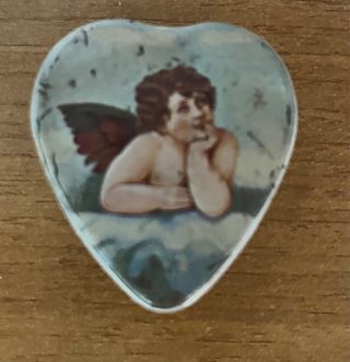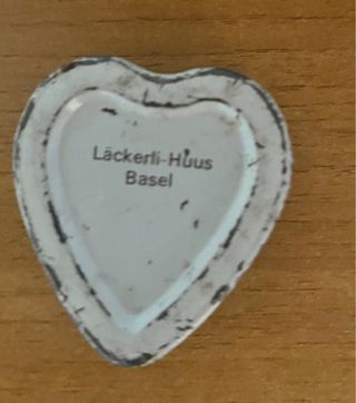 Scatolina vintage LÄCKERLI-HUUS, BASILEA, SVIZZERA. - Design a forma di cuore. - Immagine di un putto con ali. - Dettagli dipinti a mano. - Misura 4 x 5 x h 2 cm