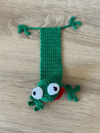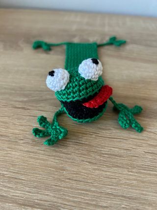 Un simpatico segnalibro a forma di rana, realizzato interamente a mano all'uncinetto. - Design a forma di rana. - Colore verde vivace. - Dettagli in nero e rosso.