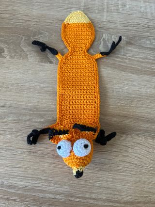 Segnalibro fatto a mano a forma di volpe, realizzato all'uncinetto. - Colore arancione con dettagli neri e gialli. - Occhi grandi e simpatici. - Design unico e divertente.